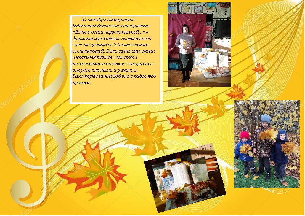 25 октября 2023 заведующая библиотекой провела мероприятие «Есть в осени первоначальной...» в формате музыкально-поэтического часа для учащихся 2-9 классов и их воспитателей. Были зачитаны стихи известных поэтов, которые в последствии исполнялись певцами на эстраде как песни и романсы. Некоторые из них ребята с радостью пропели.
