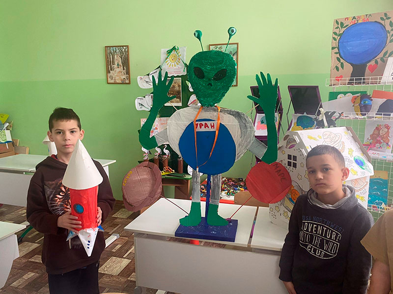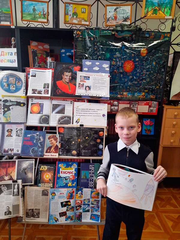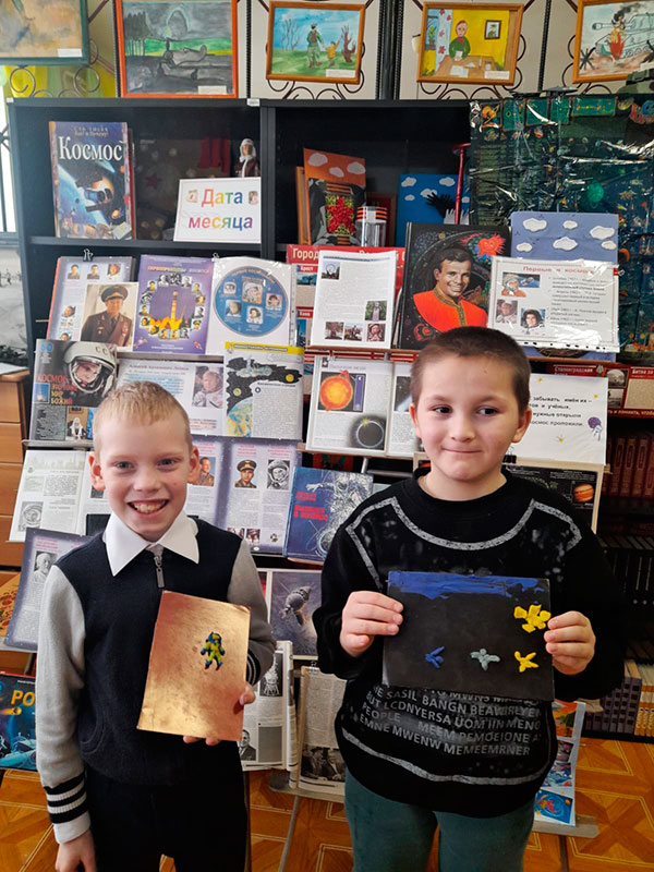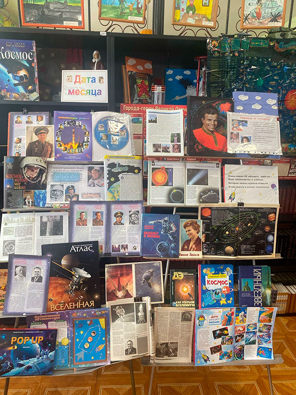К Дню Космонавтики заведующая библиотекой подготовила для ребят книжную выставку и познавательный час. С воспитанниками провели беседу и викторину о биографии первых космонавтов. Ребята сделали поделки, рисунки, аппликации и посмотрели мультфильм о космосе.